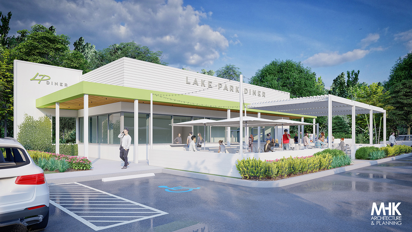 As part of the design team at MHK Architecture and Planning I was in charge of creating architectural illustrations for this new restaurant concept for Smith Organics. The restaurant has been through alot of several design iterations but we finally landed on a winning combination. Lake Park Diner is a “counter style” restaurant with both a food and drink service window and outdoor dining. The venue will feature live music, games and a projector screen to create an uplifting atmosphere and fun place to hang out with friends and family.
